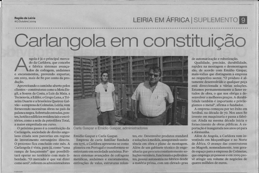 Angola é já o principal mercado da Carldora, que concebe e fabrica sistemas avançados de cofragem, andaimes e escoramentos, prevendo exportar, em 2009, mais de 80 por cento da produção. Aproveitando o caminho aberto pelos clientes – construtoras como a Mota Engil, a Soares da Costa, a Luís da Maia, a Tecnonvia, a Edifer, o Grupo Lena, a Teixeira Duarte e a brasileira Queiroz Galvão – a empresa de Colmeias, Leiria, vem fornecendo sucessivas obras no país da palanca negra. Sobretudo estradas, pontes, hotéis e edifícios residenciais e escritórios, como a sede da petrolífera Total, a maior empreitada em curso.